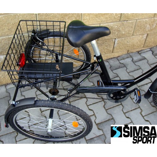 3-kolka s elektropohonem na kolech 24". Vybavení: přední a zadní brzda, osvětlení, jednorychlostní převod, motor 36V/250W v předním kole, baterie Li-ion 36V/10,4 Ah. Nosnost 100 kg, hmotnost 27 kg. Rozvor zadních kol 78 cm(projde dveřmi 80 cm). Nástupní výška 39 cm. Rozměry koše 500 x 340 x 220 mm. Rozměr tříkolky š800 x d1750 x v1200. Rozměr pro přepravu se sklopenými řidítky a otočeným předním kolem napříš je š800 x d1500 x v1000 mm.