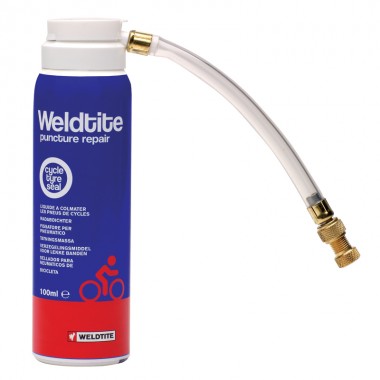 Pro bleskovou opravu tubeless plášťů je ideálním řešením tato těsnicí latexová pěna Weldtite ve spreji. Jednoduchou aplikací přes hadičku našroubovanou na ventilek dokáže i bez nutnosti jeho demontáže nahustit okamžitě pneumatiku a zároveň zacelit defekt pro dojezd do cíle. Obsah spreje zvládne opravit jeden pár silničních plášťů nebo jeden bikový plášť.