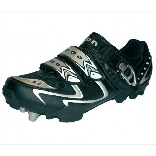 MTB závodní tretry popis: zpevněná podrážka, 2 přezky se suchým zipem,mikro nastavitelná přezka, ventilační systém, výměnné hřeby na špičce kompatibilita: SPD